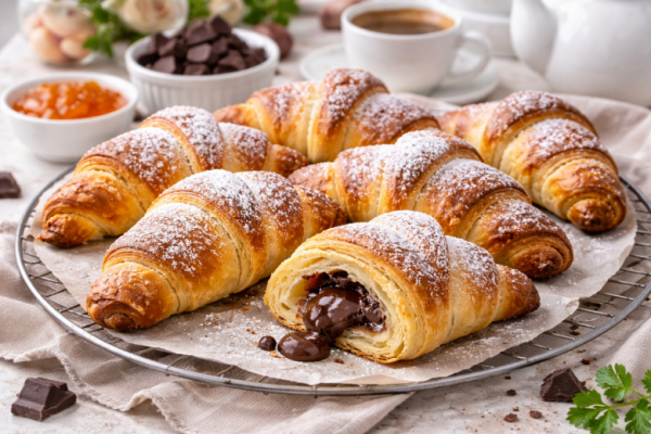 Долгое время я думала, что настоящие круассаны можно приготовить только из сложного слоёного теста. Но однажды попробовала этот домашний вариант — и теперь пеку их регулярно. Тесто получается мягкое, ароматное, а внутри прячется тёплый шоколад. Домашние съедают такие круассаны ещё горячими.