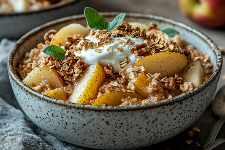 Одно яблоко и одну грушу очищаю от кожуры и нарезаю небольшими кубиками. Выкладываю фрукты в жаропрочную форму, добавляю 40-60 г овсяных хлопьев, мёд и корицу по вкусу, затем тщательно все перемешиваю. Отправляю форму в разогретую до 180°C духовку на 15-20 минут, пока фрукты не станут мягкими, а овсянка сверху не подрумянится. Готовый крамбл подаю сразу, добавив сверху столовую ложку греческого йогурта и посыпав измельченными грецкими орехами (3-4 шт).
