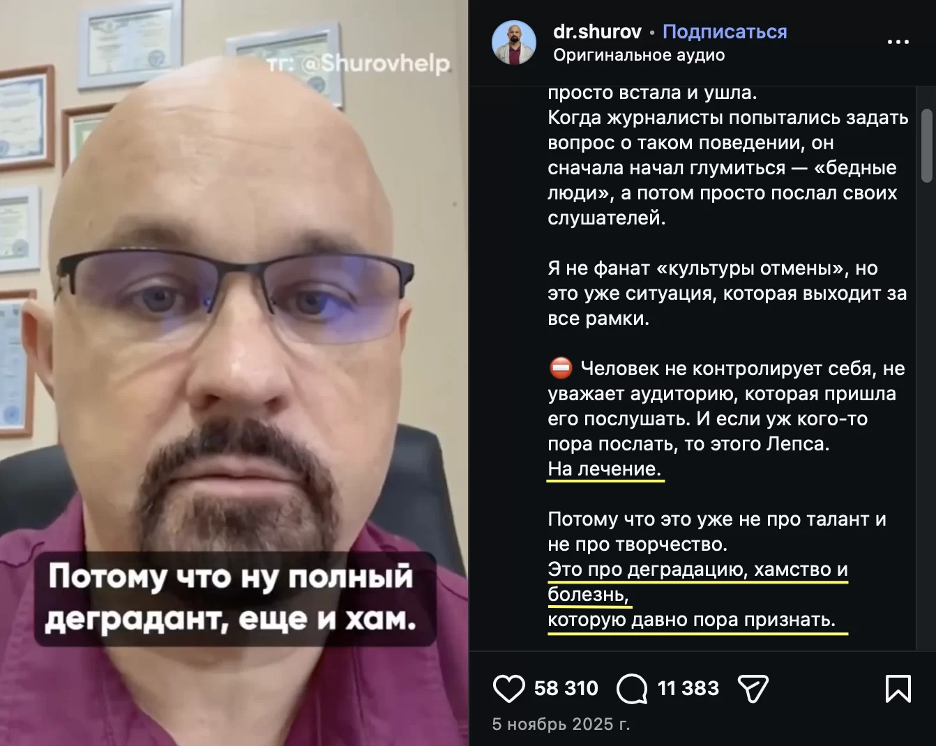 В октябре 2025 года гастрольный график артиста рухнул, как карточный домик. Все началось 21 октября со скандального выступления во Владивостоке: зрители с ужасом наблюдали, как кумир не попадает в ноты, матерится и странно двигается. Пока пиарщики неуверенно говорили о «давлении», диагноз поставили профессионалы. Известный психиатр-нарколог Василий Шуров, разобрав кадры с концерта, публично заявил, что ситуация вышла из-под контроля.