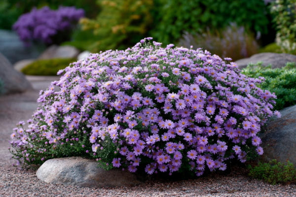 Это многолетнее растение удивительно тем, что от природы растёт плотным, компактным кустом сферической формы, достигая 30–50 сантиметров в высоту. В течение всего лета кустик радует глаз густой зелёной листвой, а ближе к осени, в августе–сентябре, превращается в сплошное цветущее облако, сплошь усыпанное мелкими ромашковидными соцветиями белого, розового, сиреневого или голубого оттенков. Цветение длится до самых заморозков, добавляя саду красок, когда большинство растений уже отцвели.