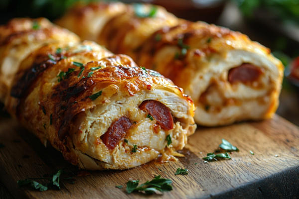 500 г куриного фарша смешиваю с 20-25 г панировочных сухарей и формирую из массы 3 плоские лепешки толщиной около 1,5 см. Для начинки вариант 1: смазываю лепешку 2 ст. л. томатного соуса, выкладываю 5 ломтиков пепперони и посыпаю 20 г тертого пармезана. Для варианта 2: смазываю лепешку 1 ст. л. песто и выкладываю 2 ломтика моцареллы. Для варианта 3: выкладываю 1 ломтик индейки и 2 ломтика гауды. Аккуратно заворачиваю каждую лепешку в плотный рулет, обваливаю в дополнительных панировочных сухарях и выкладываю на противень. Запекаю в разогретой до 180°C духовке 25-30 минут до золотистой корочки.