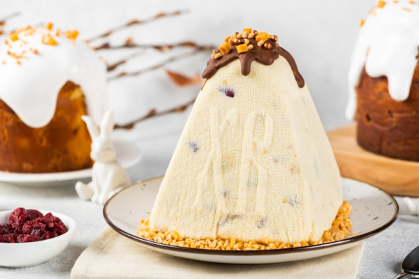 Творог. Вместо 0% берите 5% — пасха будет нежнее, а калорийность вырастет всего на 20–30 ккал на 100 г. Творог 9% уже даст около 150 ккал на 100 г — тоже приемлемо, если не злоупотреблять.