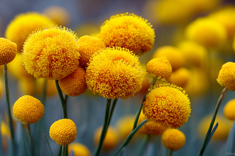 Краспедия шаровидная «пуговицы Билли» (Craspedia globosa Billy Buttons) — это эффектный многолетник родом из Австралии, который в условиях средней полосы чаще выращивают как однолетник. Растение привлекает внимание необычными ярко-желтыми соцветиями в форме плотных шариков диаметром 2–4 см, напоминающих миниатюрные помпоны или теннисные мячики. Прямые жесткие стебли высотой 50–90 см венчаются этими золотистыми «головками», которые держатся до самых заморозков, а серо-зеленые стреловидные листья собраны в прикорневую розетку.