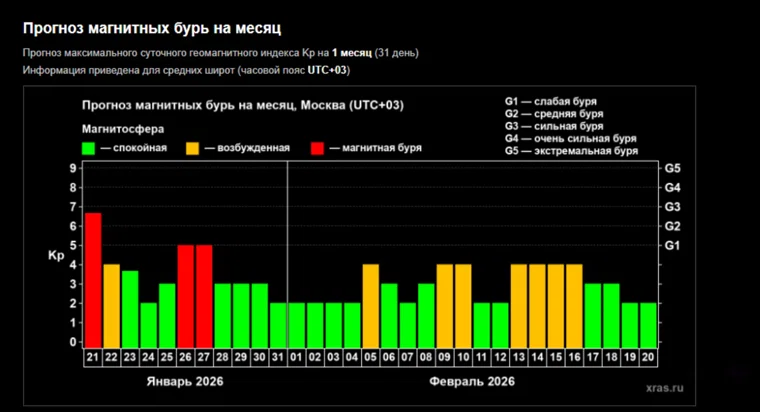 - 26–27 января — ожидаются магнитные бури силой до 5 баллов (уровень G1), это умеренная геомагнитная активность, которая может влиять на самочувствие чувствительных людей.